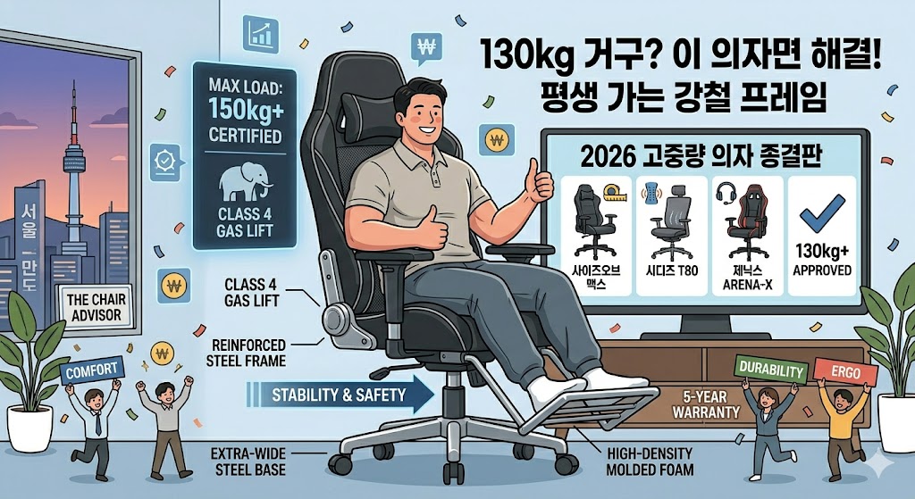 - 핵심: 130kg 넘으면 의자 ‘다리’가 아니라 ‘중심봉(가스 스프링)’ 등급을 봐야 합니다.